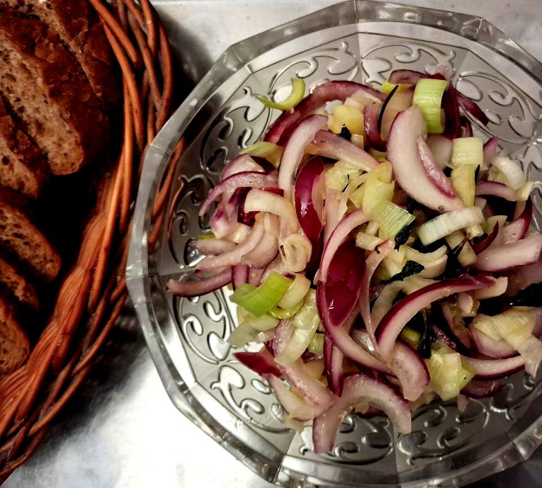 Kontynuacja przepisów rodem ze średniowiecznej Anglii 🙂 Po ostatnio przygotowanym kurczaku według przepisu z 1381 roku, w dniu dzisiejszym – Sałata z pora i cebuli z dodatkiem oliwy, soli, pieprzu, rozmarynu i mięty Przepis z dawnej księgi, pierwszej znanej angielskiej książki kucharskiej „The Forme of Cury” (tytuł nadany w 1780 roku przez Samuela Pegge), spisanej w oryginale przez nadwornego kucharza króla Ryszarda II w 1390 roku. Zapraszam do kolejnej kulinarnej przygody 🙂
