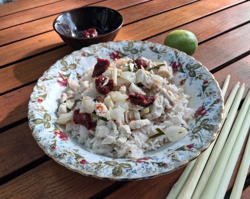 Sposób przygotowania: Siekamy szalotki, kurczaka kroimy w paski, łodygi cytrynowe kroimy w kawałki. Gotujemy ryż z dodatkiem gałki muszkatołowej oraz pieprzu. W międzyczasie szykujemy kurczaka: gotujemy ok. 300 ml wody z dodatkiem trawy cytrynowej, galangalu, liści limonki, czosnku (uprzednio obranego) oraz odrobiny soli. Kiedy woda zawrze dodajemy kurczaka po kawałku, tak aby woda nie przestawała się gotować. Gotujemy ok. 10-15 minut, celem redukcji płynu. Na patelni rozgrzewamy olej i rumienimy na nim szalotki. Ryż wykładamy do misek, na wierzch kładziemy kurczaka oraz szalotki. Potrawa gotowa do spożycia. W ramach dodatków, np. sambal. Smacznego! 🙂